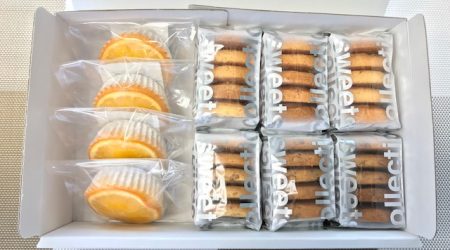 アーモンドパウダーを使用した生地に自家製のオレンジ砂糖漬けを飾り焼き上げたさわやかな風味のオレンジカップケーキ、フランスの伝統的な焼菓子という意味を持つガレット、厚めの生地をサクサクに焼き上げたガレット、はちみつとクルミに、国産バターをたっぷりと使用した生地をサクサクに焼き上げた蜂蜜と胡桃のジンジャークッキーのセット
