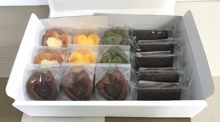 ハートのプティガトー(チョコ3個、抹茶、マンゴー、ココナッツ各2個)、ブラウニー5個